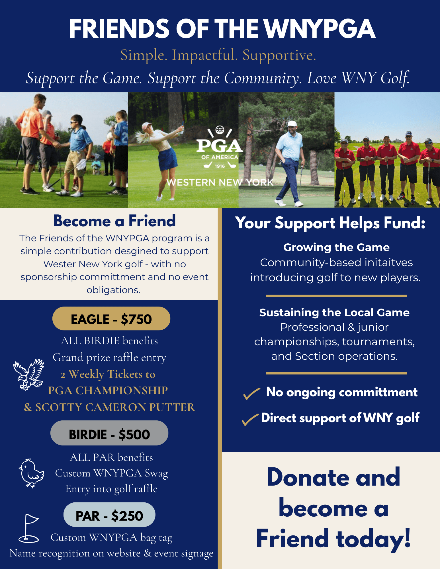 By becoming a Friend of the WNYPGA, you’re directly supporting programs that grow the game, strengthen the community, and create memorable experiences for golfers of all ages and abilities. Your support helps fuel youth golf, local championships, community outreach, and opportunities that introduce golf to new players across the region.